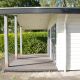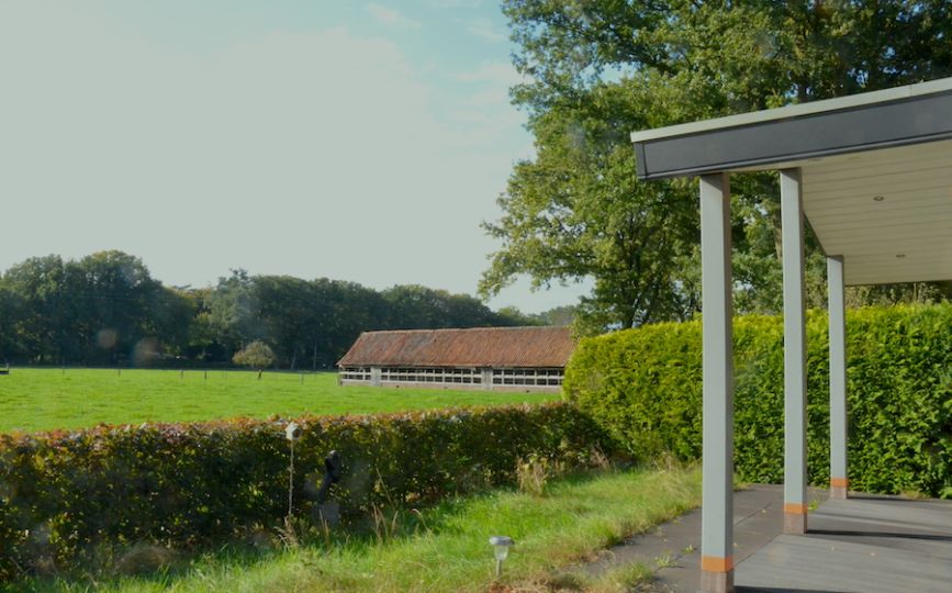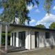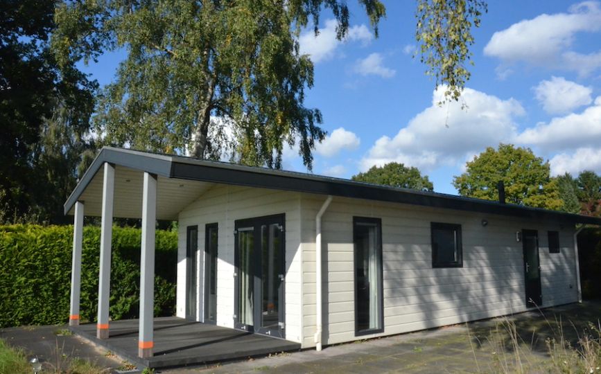 Een modern chalet, strak vormgegeven en vervaardigd uit onderhoudsvriendelijk kunststof, gelegen aan de rand van het bos met uitzicht op de weilanden. Zodra u via de openslaande deuren het ruime terras betreedt, omgeven door rust en groen, voelt u direct de ontspanning. Dankzij de overkapping geniet u hier het hele jaar door van buiten zijn—of het nu gaat om een zonnige ochtendkoffie of een knusse avond met een dekentje.