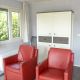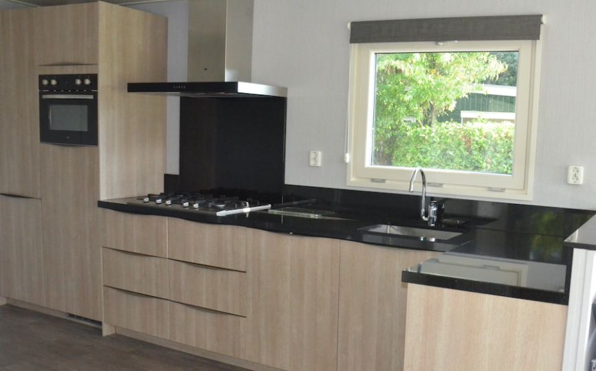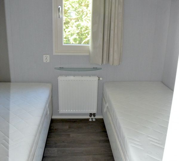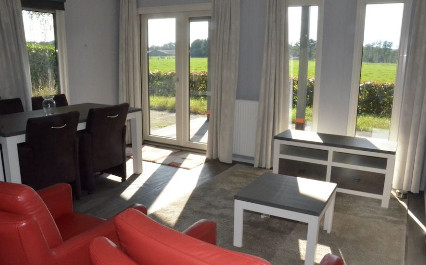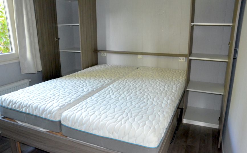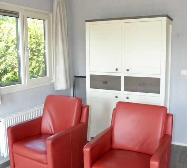 Binnen wacht een verrassend ruim interieur, slim ingedeeld en afgewerkt in een eigentijdse stijl. De woonkamer is licht en uitnodigend, perfect om tot rust te komen. Het chalet wordt geleverd inclusief eettafel, eetstoelen, twee comfortabele stoelen, een salontafel, modern dressoir en moderne buffetkast. Daarnaast zijn de openslaande deuren en alle ramen voorzien van horren. Ook is er in ieder vertrek centrale verwarming aanwezig.